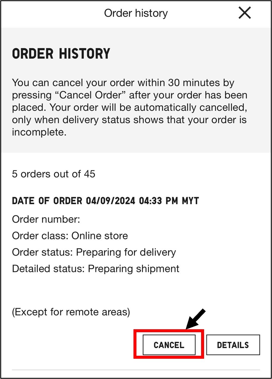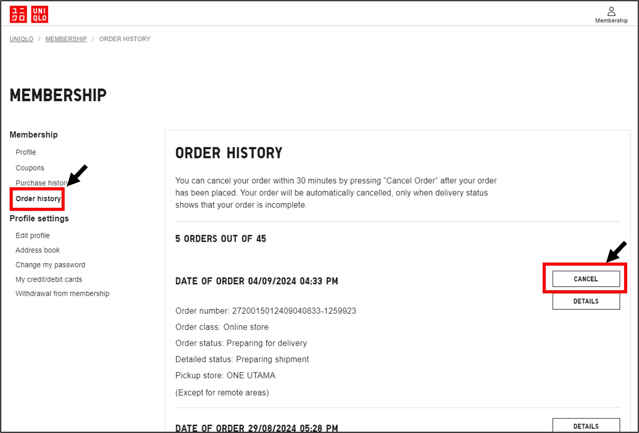 Step 2. Click the 【Order history】 and find the desired order and click 【CANCEL】.